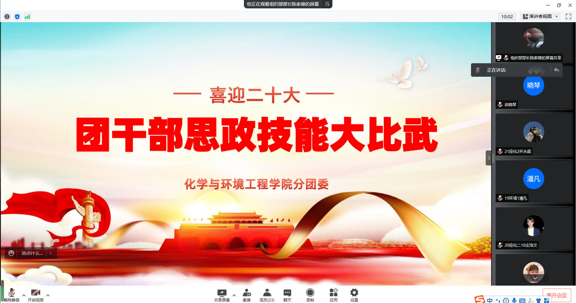 4月13日,我院线上组织开展新思想公开课暨2022年“喜迎二十大 永远跟党走 奋进新征程”团支书思政技能大比武。院分团委书记谈晓琴、21级辅导员牛志刚、全院20级、21级团支书和入团积极分子等参加了本次活动。