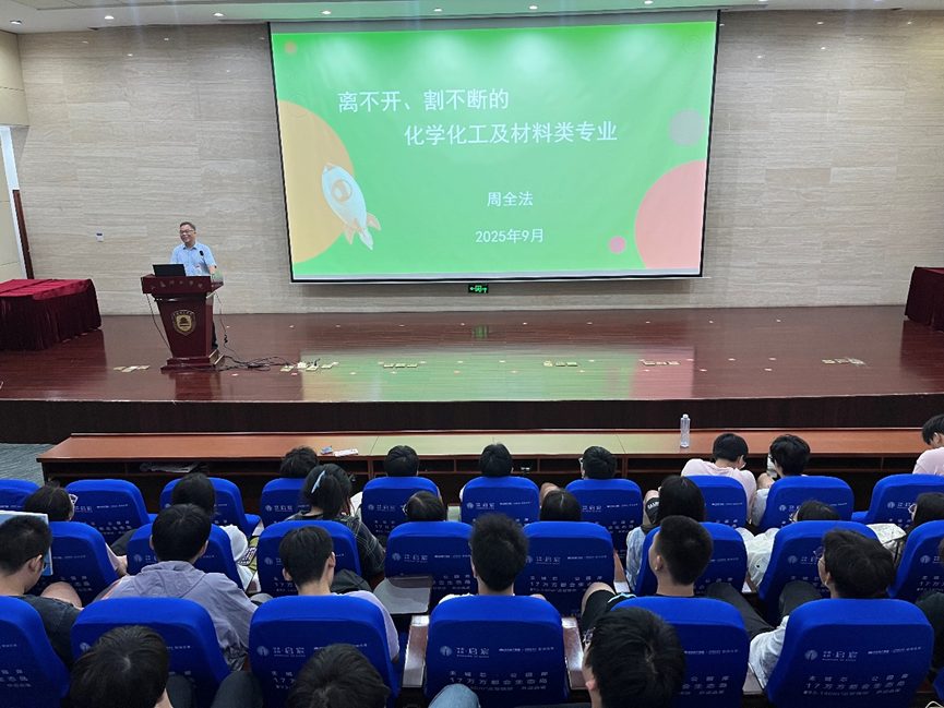 周全法为新生主讲专业导学课——《离不开、割不断的化学化工材料类专业》。他从“何为大学、何为江理工”的思考引入,引导新生思考大学学习的意义与目标。随后,他深刻阐释了化学、化工及其材料类专业在人类社会进步、国家发展战略和日常生活中不可或缺的重要地位,揭示了其“离不开、割不断”的学科特性和广阔前景。他详细介绍了学院在相关领域的学科优势、师资力量、科研平台及人才培养成果,增进了新生对学院和专业的认同感与自豪感。最后,周全法聚焦“化工人的素养与使命”,对新生提出了殷切期望:要尽快适应大学学习节奏,夯实数理化和专业基础;要注重培养严谨求实的科学精神、创新思维和实践能力;要锤炼团队协作精神,拓展国际视野,深刻理解并主动担当起推动科技进步、服务国家战略需求、促进社会可持续发展的化工人的崇高使命,为未来的职业发展和社会发展打下坚实的基础。