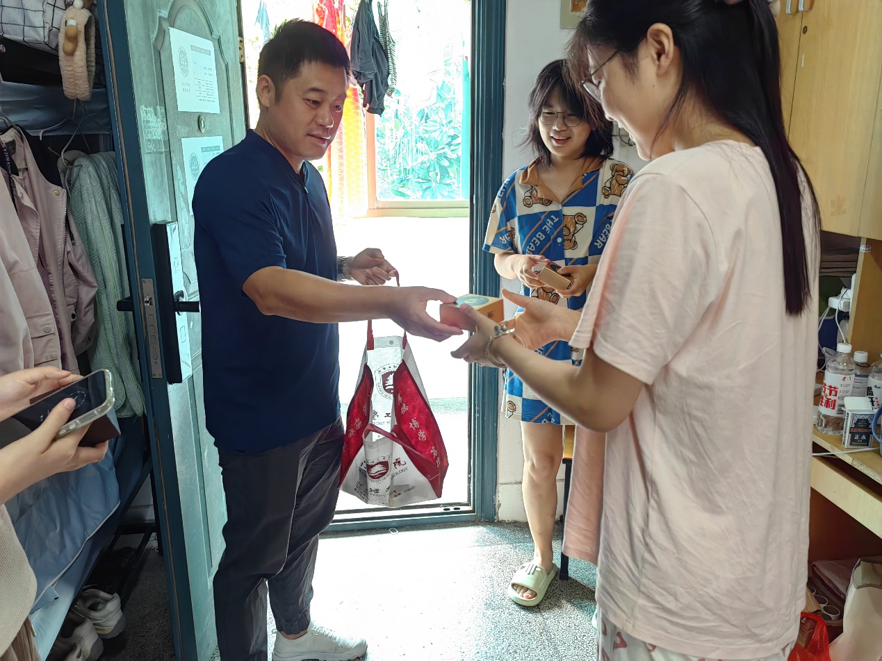 走访过程中,凌诚与新生辅导员逐一走进留校新生宿舍,与同学们亲切交谈。每到一处,他们都仔细询问新生的假期安排、学习生活情况及遇到的困难,并送上精心准备的月饼、面包等节日礼品。凌诚在交流中表示:"中秋是团圆的节日,学院始终牵挂着每一位留校新生。希望大家合理安排假期时间,既要放松身心,也要保持学习状态,遇到问题随时联系辅导员老师。"他特别叮嘱新生要尽快适应大学生活,珍惜同窗情谊,在化学化工学院这个大家庭中共同成长。