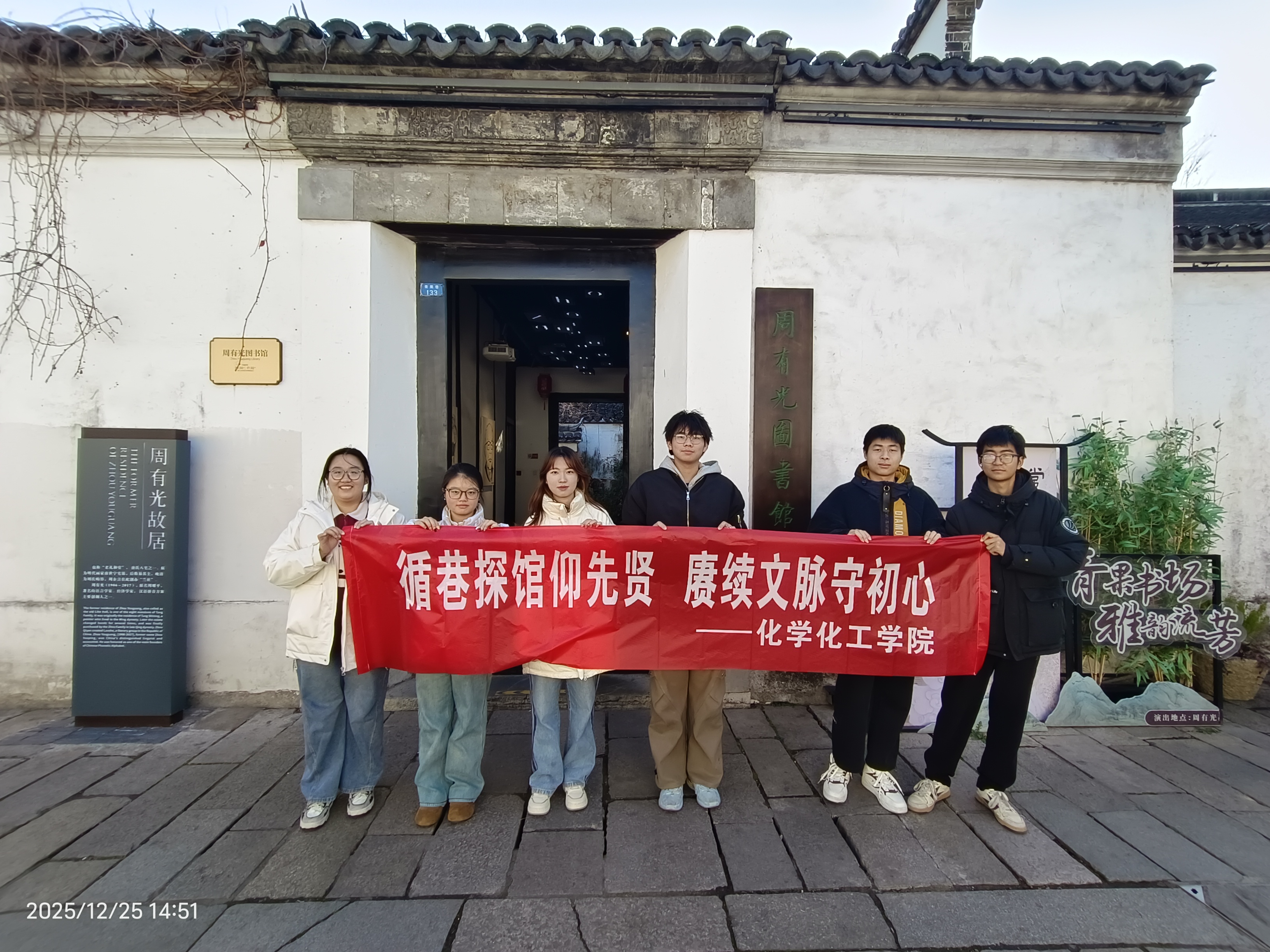寒假期间,化学化工学院青果寻脉·匠心传承实践队走进常州青果巷历史文化街区、周有光图书馆及唐荆川纪念馆,以实地探访、史料研读、交流体悟等形式,开启了一场触摸历史根脉、传承文化匠心的实践之旅,让青年力量在文化传承中焕发新活力。